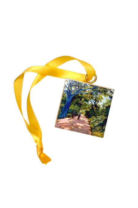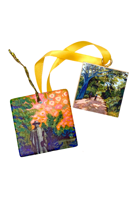 - Ceramic 2"x2" ornament featuring the Stevie Ray Vaughan statue at Auditorium Shores on the front and "Happy Trails" message on the back.